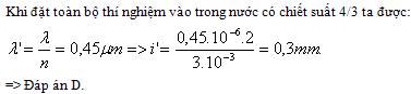 Trong thí nghiệm giao thoa ánh sáng của I âng trong không khí, hai khe cách nhau 3 mm được chiếu bằng ánh sáng đơn sắc có bước sóng 0,6 μm, màn quan sát cách hai khe 2 m. Sau đó đặt toàn bộ thí nghiệm vào trong nước có chiết suất 4/3, khoảng vân quan sát trên màn là bao nhiêu?