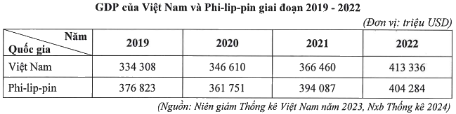 | a) Năm 2022, GDP của Việt Nam lớn hơn Phi-lip-pin. | ||