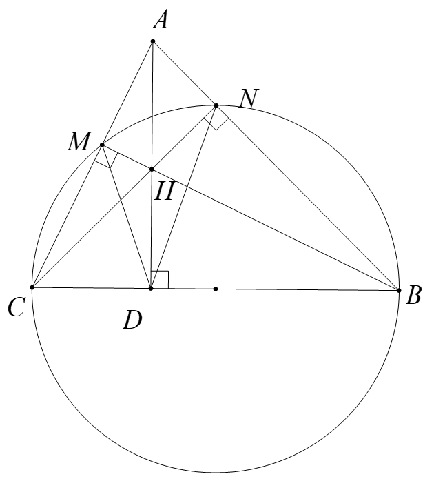 b) Gọi $D$ là giao điểm của $AH$ và $BC$. Chứng minh $DA$ phân giác của $\widehat{MDN}$