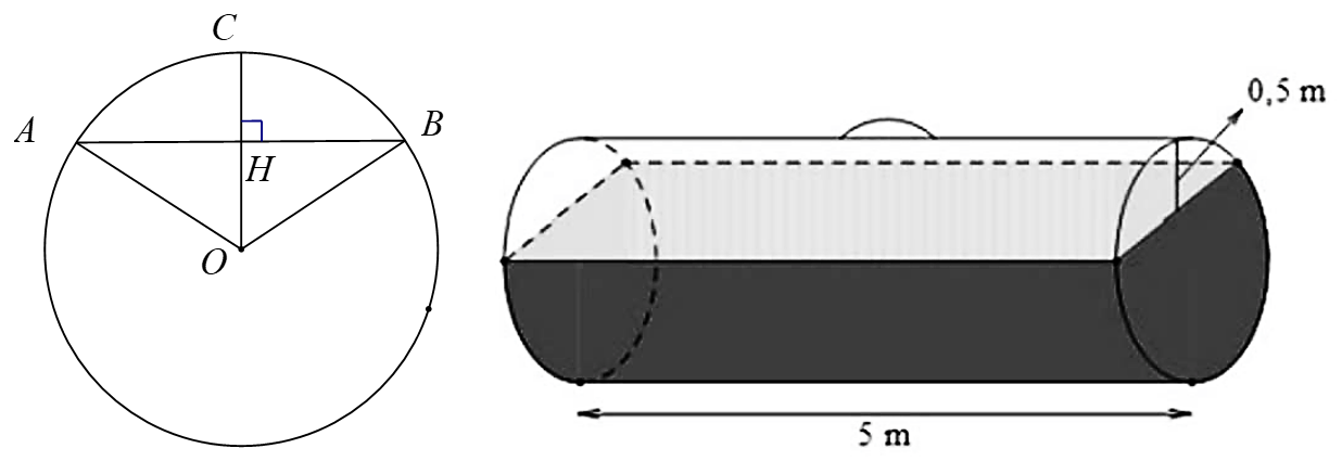 Một bồn hình trụ đang chứa dầu, được đặt nằm ngang, có chiều dài bồn là $5\,\text{m}$, có