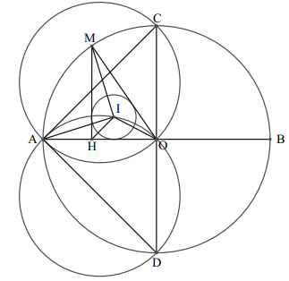 Cho đường tròn $\left( {O;R} \right)$ có hai đường kính $AB,\,\, CD$ vuông góc với nhau. Điểm $M$ di động trên cung $CAD$. Gọi $H$ là hình chiếu của $M$ trên $AB$. Gọi $I$ là tâm đường tròn nội tiếp tam giác $HMO$. Tìm quỹ tích điểm $I$ khi $M$ di động trên cung $CAD$.