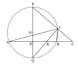 Cho đoạn thẳng $AC$ cố định, điểm $B$ cố định nằm giữa $A$ và $C$. Đường tròn $(O)$ thay đổi luôn đi qua $A$ và $B$. Gọi $PQ$ là đường kính của đường tròn $(O)$, $PQ\bot AB$ ($P$ thuộc cung lớn $AB$). Gọi $CP$ cắt đường tròn $(O)$ tại điểm thứ hai $I$. Chứng minh $QI$ luôn đi qua một điểm cố định khi đường tròn $(O)$ thay đổi
