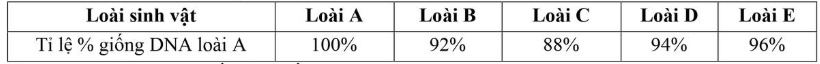 Để xác định mối quan hệ họ hàng giữa loài A và các loài B, C, D, E, người ta nghiên cứu mức độ giống nhau về DNA của các loài này so với DNA của loài A. Kết quả thu được (tính theo tỉ lệ % giống nhau so với DNA của loài A) như sau: