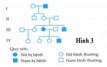 Một bệnh di truyền đơn gene được biểu diễn qua sơ đồ phả hệ ở Hình 3. Kết luận nào dưới đây là đúng về bệnh di truyền trên?