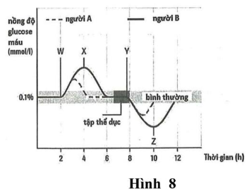 Lượng đường trong máu của một người mắc bệnh đái tháo đường và một người không mắc bệnh có cùng khối lượng cơ thể được theo dõi trong khoảng thời gian 12 giờ. Cả hai người đều ăn một bữa giống hệt nhau tại thời điểm W và thực hiện 1 giờ tập thể dục tại thời điểm Y với cường độ giống nhau. Sử dụng dữ liệu được cung cấp từ hình 8 và cho biết mỗi nhận định sau đây là đúng hay sai?