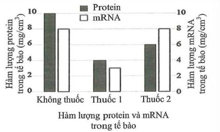 Để nghiên cứu cơ chế tác động của hai loại thuốc mới điều trị bệnh nhân Covid-19 (thuốc 1 và thuốc 2) người ta tiến hành thử nghiệm tác động của chúng lên quá trình biểu hiện gene của gene virus trong các tế bào người. Hàm lượng mRNA của virus và protein virus trong các mẫu tế bào được thể hiện theo biểu đồ bên. Biết rằng các điều kiện thí nghiệm là như nhau.