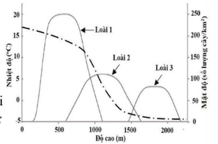 Biểu đồ hình bên thể hiện mật độ cá thể của 3 loài thực vật phân bố ở các độ cao