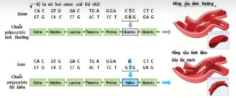 Hình dưới đây mô tả cơ chế phân tử của bệnh hồng cầu hình liềm. Quan sát hình bên dưới