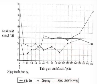 | a) Nồng độ muối mật ở nhóm trẻ uống sữa bò luôn cao hơn ở nhóm trẻ uống sữa mẹ. | ||