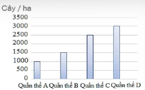 Hình bên mô tả khu vực phân bố và mật độ của 4 quần thể thực vật thuộc 4 loài khác nhau trong một khu vực, tại cùng 1 thời điểm. Biết rằng diện tích phân bố của 4 quần thể A, B, C, D đều là 2,5 ha. Quần thể có kích thước lớn nhất gấp bao nhiêu lần kích thước trung bình của cả 4 quần thể? (thể hiện kết quả dưới dạng số thập phân, làm tròn đến 1 chữ số sau dấu phẩy).