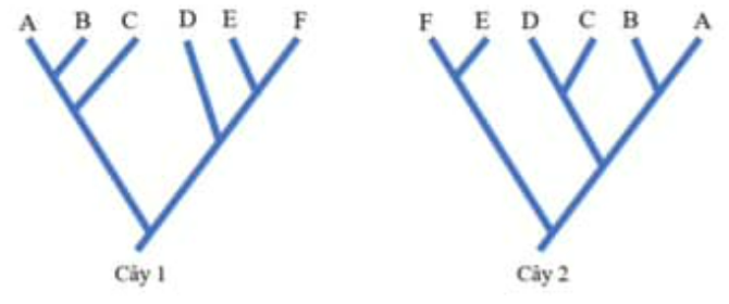 Dùng thông tin sau để trả lời 2 câu hỏi tiếp theo: Trong hai cây phát sinh chủng loại trong hình dưới đây, các chữ cái (A-F) đại diện cho các loài.