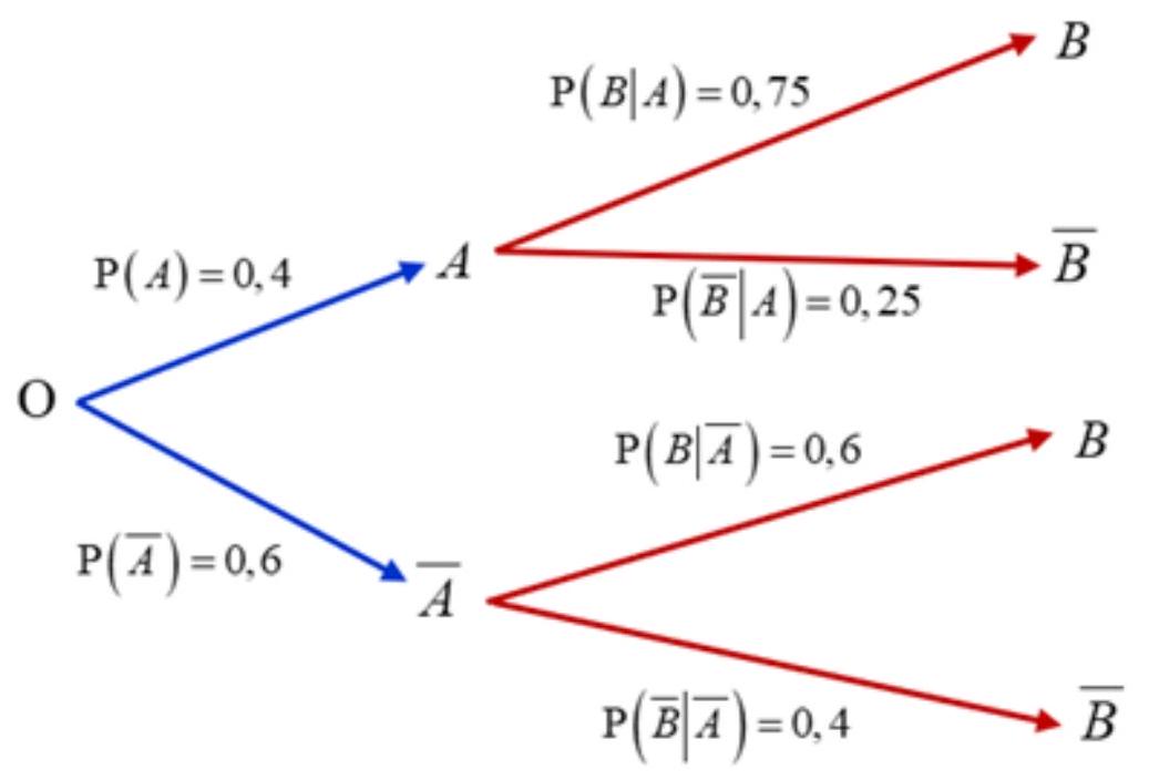 | b) $P\left( \overline{B} \middle| A \right) = 0,75$ và $P\left( \overline{B} \middle| \overline{A} \right) = 0,6$. | ||