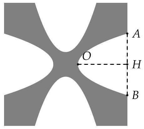 Một hoa văn trang trí được tạo ra từ một miếng bìa hình vuông cạnh bằng 13 cm bằng cách khoét đi bốn phần bằng nhau có hình dạng parabol như hình vẽ bên. Biết $AB = 6$ cm, $OH = 1$ cm. Gọi $S$ là diện tích của bề mặt hoa văn đó (đơn vị: cm2). Tính $\dfrac{S}{13}$ (kết quả làm tròn đến chữ số thập phân thứ nhất).