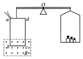 Một cuộn dây hình chữ nhật abcd, được quấn tổng cộng 50 vòng, được treo ở đầu bên trái của một chiếc cân, cạnh bc của cuộn dây dài 15 cm, nằm ngang trong từ trường đều có vectơ cảm ứng từ vuông góc với mặt phẳng khung dây. Ban đầu, cân nằm cân bằng. Sau đó cho dòng điện có cường độ 2 A chạy qua cuộn dây; để cân nằm cân bằng thì phải thêm một quả nặng 60 g vào đĩa cân bên phải. Lấy $g = 10\,\, m/s^{2}$. Xác định chiều dòng điện trong cuộn dây và độ lớn cảm ứng từ của từ trường?