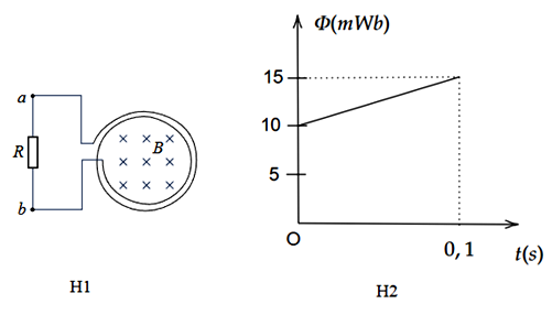 Ở hình (H1), hai đầu của một cuộn dây có 200 vòng (trong hình chỉ vẽ 2 vòng), được nối với điện trở $R = 48\,\,\Omega$. Điện trở của cuộn dây là $r = 2\,\,\Omega$. Một từ trường đều vuông góc với mặt phẳng cuộn dây. Từ thông qua diện tích giới hạn bởi cuộn dây theo thời gian như hình (H2).