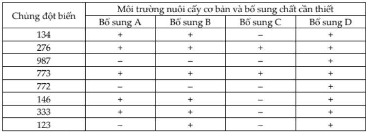 Ở một loài vi khuẩn, sự chuyển hóa chất dinh dưỡng D tối cần thiết cho sự sinh trưởng diễn ra theo sơ đồ: Tiền chất (có sẵn) → A, B, C → D. Trong đó có các chất A, B, C có thứ tự chuyển hóa chưa được làm rõ. Quá trình đột biến đã tạo ra một số chủng bị mất khả năng chuyển hóa chất D (do enzyme tham gia giai đoạn nhất định nào đó trong quá trình chuyển hóa bị mất hoạt tính). Kết quả nghiên cứu các chủng đột biến (được kí hiệu bằng các chữ số) trong các môi trường nuôi cấy có bổ sung một trong 4 chất A, B, C, D được thể hiện ở bảng: