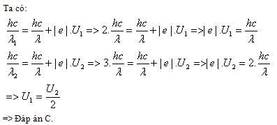 thì hiệu điện thế hãm để triệt tiêu dòng quang điện có độ lớn tương ứng là U1 và U2, với