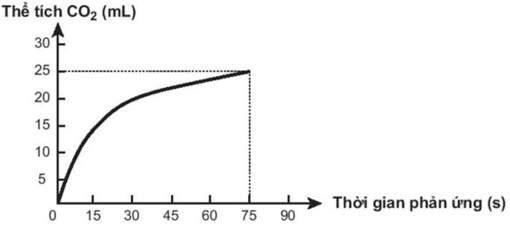 Thực hiện phản ứng sau: CaCO3 + 2HCl ⟶ CaCl2 + CO2 + H2O. Theo dõi thể tích CO2 thoát ra theo thời gian, thu được đồ thị như sau (thể tích khí được đo ở áp suất khí quyển và nhiệt độ phòng).