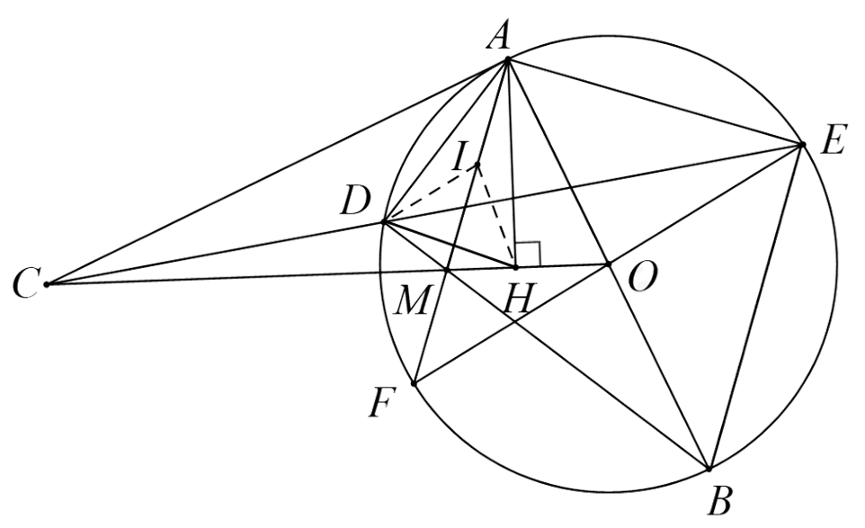 Cho đường tròn $(O)$ đường kính $AB$. Trên tiếp tuyến tại $A$ của đường tròn $(O)$lấy điểm $C$. Vẽ cát tuyến $CDE$ của đường tròn $(O)$ (tia $CD$ nằm giữa 2 tia $CA,CO$ và điểm $D$ nằm giữa hai điểm $C$ và $E$). Gọi $M$là giao điểm của $CO$ và $BD$; $H$ là hình chiếu vuông góc của $A$ trên $CO$.