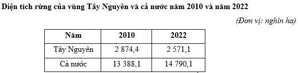 Căn cứ vào bảng số liệu trên, hãy cho biết tỉ trọng của Tây Nguyên trong tổng diện tích rừng của cả nước năm 2022 so với năm 2010 giảm bao nhiêu phần trăm (làm tròn kết quả đến một chữ số thập phân).