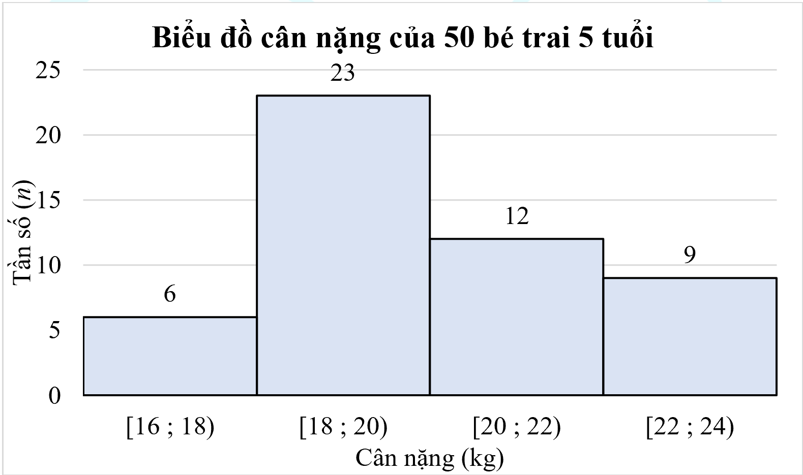 Khi điều tra cân nặng của $50$ bé trai 5 tuổi (đơn vị: kg), người ta được biểu đồ tần số