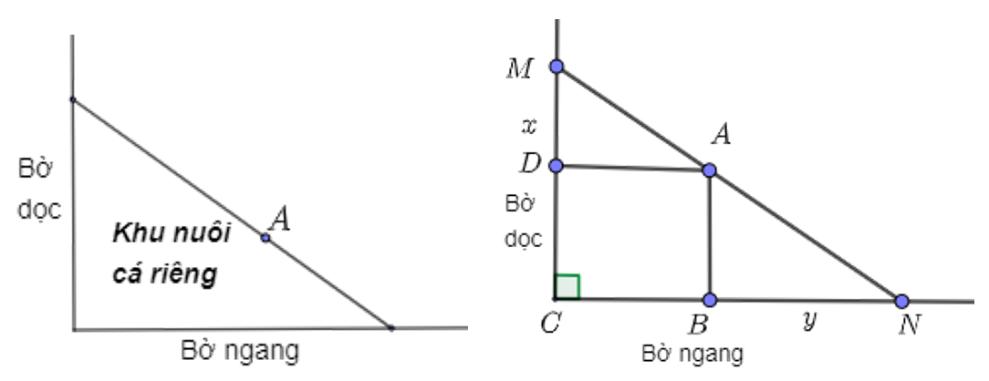 Người ta giăng lưới để nuôi riêng một loại cá trên một góc hồ. Biết rằng lưới được giăng theo một đường thẳng từ một vị trí trên bờ ngang đến một vị trí trên bờ dọc và phải đi qua một cái cọc đã cắm sẵn ở vị trí A. Hãy xác định các vị trí trên bờ ngang, bờ dọc để chiều dài lưới nhỏ nhất và tìm giá trị nhỏ nhất đó, biết rằng khoảng cách từ cọc đến bờ ngang và bờ dọc là 6 m (làm tròn kết quả đến hàng phần trăm).