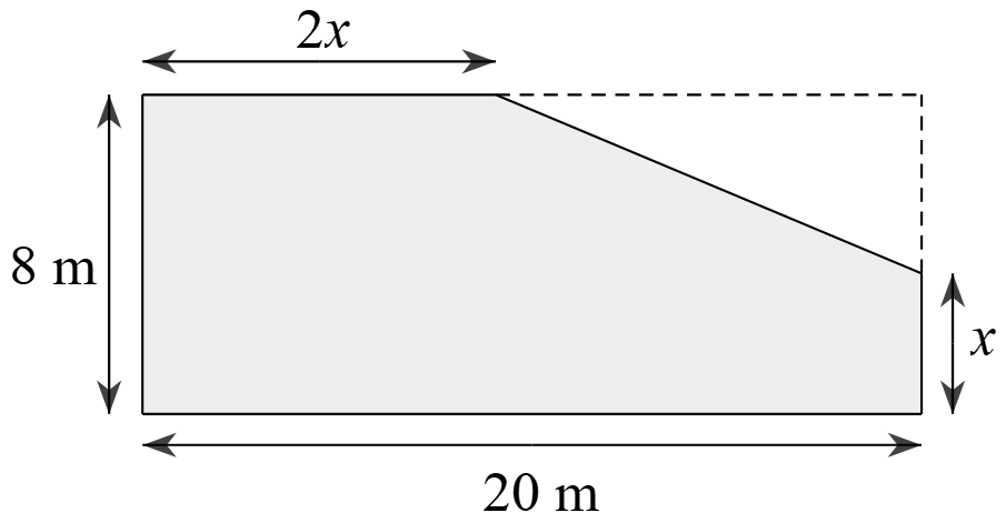 Ông An có một mảnh đất hình chữ nhật có chiều rộng là 8 m và chiều dài là 20 m. Nhà nước làm một con đường đi ngang qua mảnh đất của ông An và thu hồi một phần đất của ông An (phần hình tam giác). Phần đất không bị thu hồi có kích thước như hình vẽ dưới (phần tô đậm).