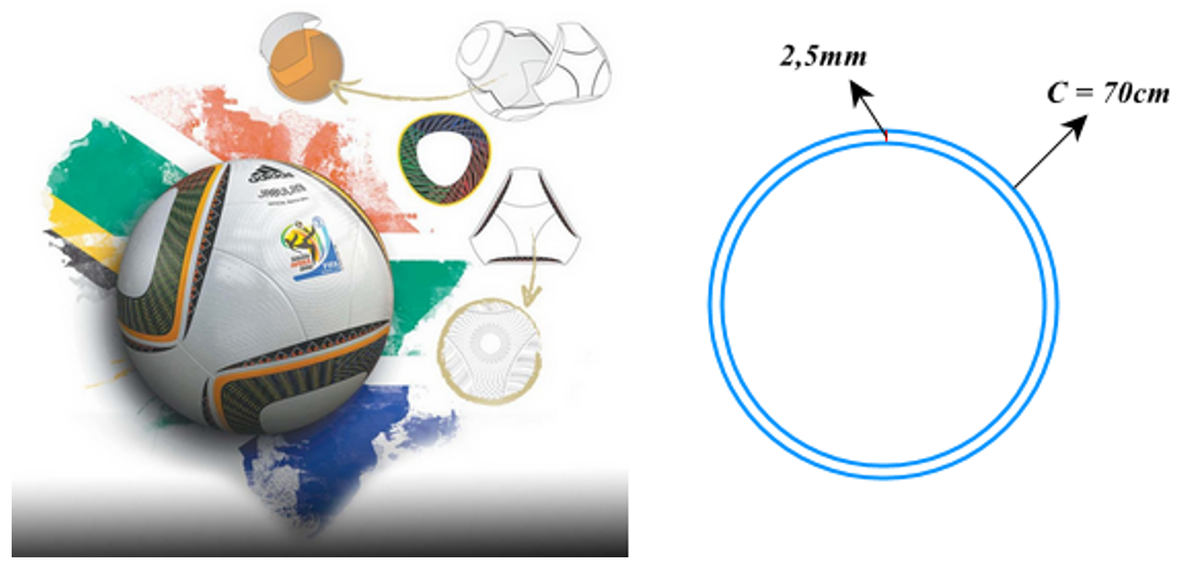 Hiện nay, người ta thường dùng chất liệu PVC (polyvinylchloride) để chế tạo vỏ quả bóng cao su dùng trong bóng đá. Một quả bóng hình cầu thường sử dụng từ hai đến bốn lớp vải lót để làm vỏ bóng và một quả bóng đá thường có chu vi đường tròn lớn từ $58 - 71$cm tuỳ vào kích thước bóng để phù hợp cho từng lứa tuổi. Bác Minh có một quả bóng đá size số 7 có chu vi $70$cm và vỏ quả bóng được tạo thành từ 4 lớp vải lót có độ dày $2,5$mm (xem hình ảnh minh hoạ).