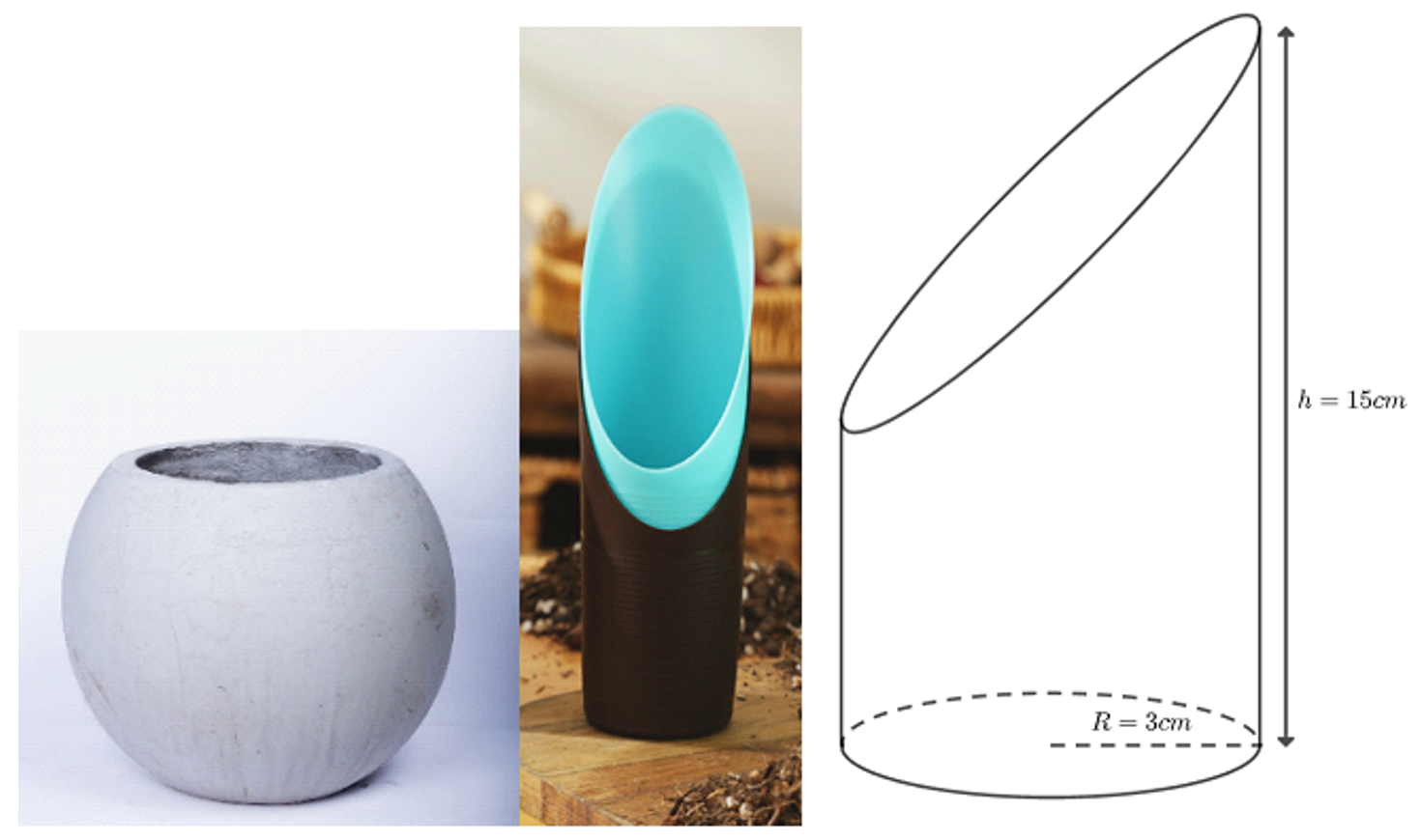 b) Sau một thời gian sử dụng, quả bóng không còn chất lượng như ban đầu nên bác Minh cắt quả bóng theo mặt cắt là một đường tròn để tái chế quả bóng thành một chậu cây có dạng như ảnh minh hoạ. Bác Minh dùng dụng cụ xúc đất như hình trên để xúc đất vào quả bóng, biết thể tích dụng cụ xúc đất bằng $70\%$ thể tích hình trụ có cùng bán kính đáy, chiều cao. Thể tích đất bác Minh cần bỏ vào quả bóng bằng $\dfrac{4}{5}$ thể tích quả bóng ban đầu. Hỏi bác Minh cần xúc ít nhất bao nhiêu lần, biết mỗi lần xúc được một thể tích đất bằng thể tích dụng cụ xúc?