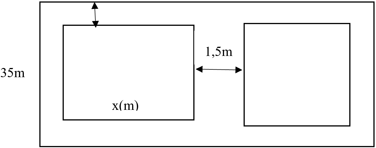 Bác Ba dự định chia làm hai khu vườn để trồng rau. Bác làm lối đi rộng $1,5(m)$ và xung quanh vườn làm rạch có bề ngang là $0,5(m)$. Mảnh vườn thứ nhất có chiều dài $x(m)$, mảnh vườn thứ hai có chiều dài ít hơn mảnh vườn thứ nhất là $15(m)$.