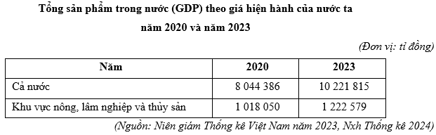 Căn cứ vào bảng số liệu trên, hãy cho biết tỉ trọng khu vực nông, lâm nghiệp và thủy sản năm 2023 giảm bao nhiều phần trăm so với năm 2020 (làm tròn kết quả đến một chữ số thập phân).