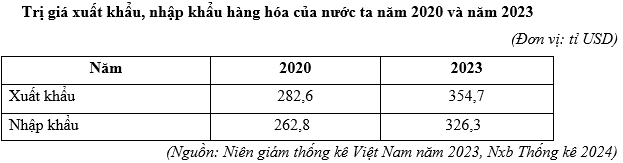 Căn cứ vào bảng số liệu trên, hãy cho biết giá trị xuất siêu năm 2023 gấp mấy lần giá trị xuất siêu năm 2020 (làm tròn kết quả đến hai chữ số thập phân) .