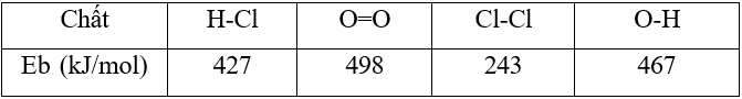 Cho phản ứng: 4HCl(g) + O2(g) $\overset{t^{0}}{\rightarrow}$2Cl2 (g) + 2H2O(g)