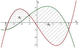 Gọi $S_{1}$ là diện tích hình phẳng giới hạn bởi đồ thị của hai hàm số $y = f(x),y = g(x)$ và hai đường thẳng $x = - 4,x = - 1$. Gọi $S_{2}$ là diện tích hình phẳng giới hạn bởi đồ thị của hai hàm số $y = f(x),y = g(x)$ và hai đường thẳng $x = - 1,x = 4$. Tính tỉ số $\dfrac{S_{1}}{S_{2}}$ (làm tròn kết quả đến hàng phần chục).