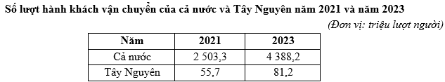 Căn cứ bảng số liệu trên, hãy cho biết giai đoạn 2021 – 2023 số lượt hành khách vận chuyển tăng thêm của cả nước gấp bao nhiêu lần số lượt hành khách vận chuyển tăng thêm của Tây Nguyên (làm tròn kết quả đến một chữ số thập phân).