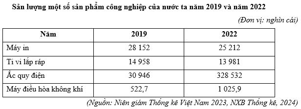 Căn cứ vào bảng số liệu, nhận xét nào sau đây đúng về sự thay đổi sản lượng một số sản phẩm công nghiệp của nước ta năm 2022 so với năm 2019?