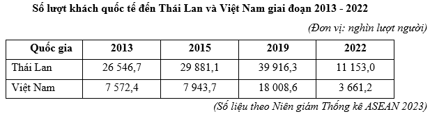| b) Số lượt khách quốc tế đến Thái Lan, Việt Nam tăng liên tục trong giai đoạn 2013 - 2022. | ||