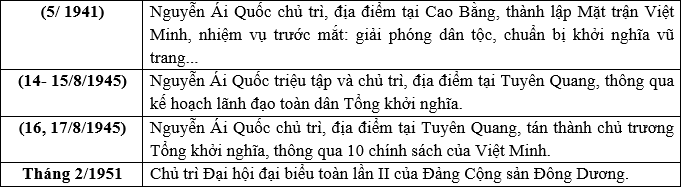 | b) Trong quá trình chuẩn bị khởi nghĩa cho cuộc vũ trang giành chính quyền, Nguyễn Ái Quốc đóng vai trò lãnh đạo, vạch ra đường lối. | ||