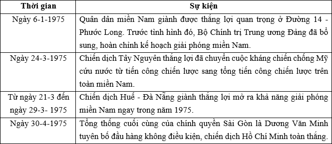 | c) Cuộc Tổng tiến công và nổi dậy năm 1975 trải qua các chiến dịch Phước Long, Tây Nguyên, Huế - Đà Nẵng, Hồ Chí Minh. | ||