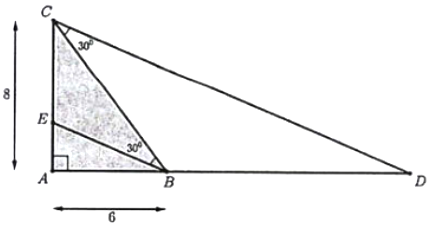 Cho tam giác ABC vuông tại A có cạnh \(A B=6, A C=8\). Điểm E thuộc đoạn AC sao cho \(\widehat{C B E}=30^{\circ}\), điểm D thuộc tia đối cùa tia BA sao cho \(\widehat{B C D}=30^{\circ}\).
