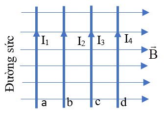 Bốn đoạn dây dẫn a, b, c, d có cùng chiều dài l, được đặt vuông góc với véctơ cảm ứng từ $\overset{\rightarrow}{B}$ trong từ trường đều, mang dòng điện có cường độ $I_{1} > I_{2} > I_{3} > I_{4}$ (hình vẽ). Lực từ do từ trường đều tác dụng lên đoạn dây dẫn nào là yếu nhất?