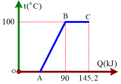 Một học sinh tiến hành đun một lượng nước đá đựng trong nhiệt lượng kế từ $0\,\,^{0}C$ đến khi tan chảy hết thành nước và hóa hơi ở $100\,\,^{0}C$. Hình bên là đồ thị biểu diễn sự phụ thuộc của nhiệt lượng mà khối nước đá nhận được từ lúc đun đến lúc hóa hơi và sự thay đổi nhiệt độ của nó.