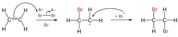 $\left. \text{CH}_{2} = \text{CH}_{2} + \text{Br}_{2}\rightarrow\text{CH}_{2}\text{Br} - \text{CH}_{2}\text{Br} \right.$