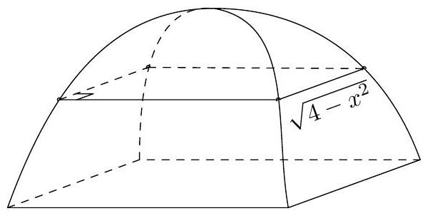 Một cái màn chụp có dạng như hình vẽ bên. Biết rằng mặt cắt của cái màn theo mặt phẳng song song với mặt phẳng đáy và cách mặt đáy một khoảng bằng $x\left( \text{m} \right)$, $0 \leq x \leq 2$ là một hình vuông cạnh bằng $\sqrt{4 - x^{2}}\left( \text{~m} \right)$. Thể tích của cái màn là bao nhiêu mét khối? (Làm tròn kết quả đến hàng phần mười).