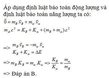 Hạt nhân mẹ A có khối lượng mA đang đứng yên, phân rã thành hạt nhân con B và hạt α có khối lượng mB và mα . So sánh tỉ số động năng và tỉ số khối lượng của các hạt sau phản ứng, hãy chọn kết luận đúng.