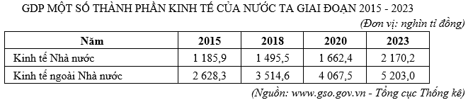 Theo bảng số liệu, để thể hiện tốc độ tăng trưởng GDP một số thành phần kinh tế của nước ta giai đoạn 2015 - 2023, dạng biểu đồ nào sau đây là thích hợp nhất?