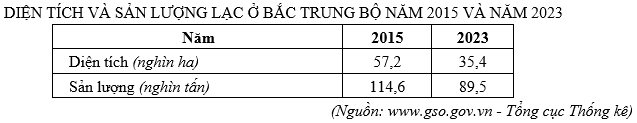 Căn cứ vào bảng số liệu, cho biết năng suất lạc ở Bắc Trung Bộ năm 2023 tăng bao nhiêu tạ/ha so với năm 2015 (Làm tròn kết quả đến một chữ số thập phân).
