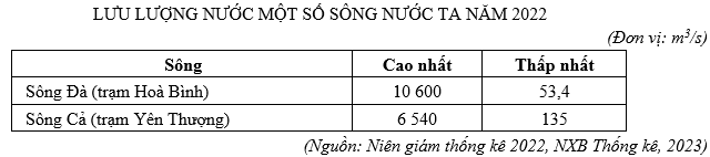 Căn cứ vào bảng số liệu, cho biết chênh lệch lưu lượng nước giữa tháng cao nhất và tháng thấp nhất của Sông Đà (trạm Hòa Bình) so với sông Cả (trạm Yên Thượng) là bao nhiêu m3/s? (Làm tròn kết quả đến hàng đơn vị).
