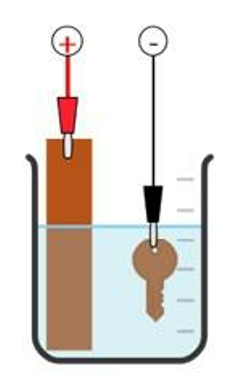 Phương pháp điện phân được sử dụng trong mạ điện, dưới đây là hình mô tả quá trình mạ đồng lên bề mặt chìa khóa.