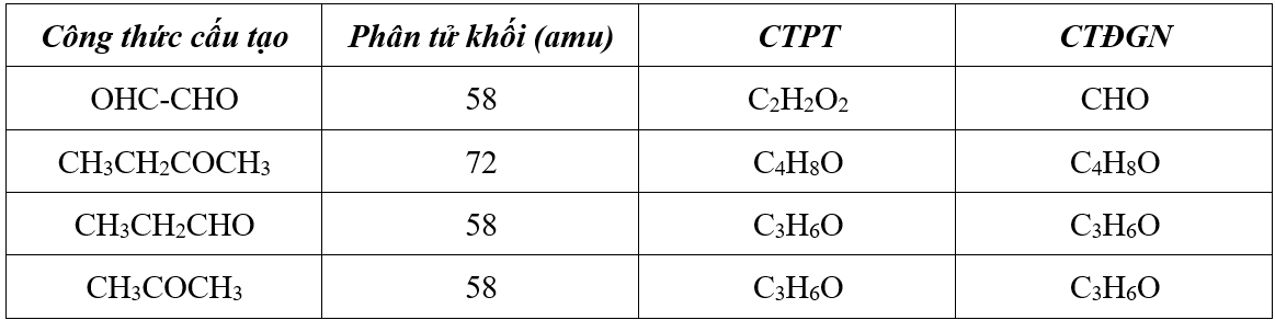 Chất hữu cơ X có công thức phân tử không trùng công thức đơn giản nhất, phổ khối lượng của X cho biết peak ion phân tử có giá trị m/z=58. Chất X có thể là chất nào sau đây?